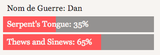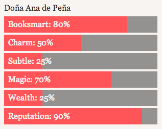 属性界面的核心是“属性图表”,您可以使用 *stat_chart 指令创建。该图表可显示任意数量的 ChoiceScript 变量值;若变量值为 1 到 100 之间的数字,则可将其显示为图表上的条形图。