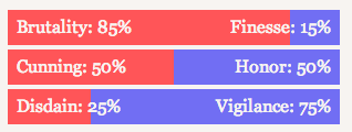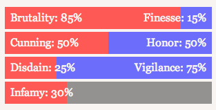 然而,在我们的 ChoiceScript 代码中,实际上只有三个变量:“残暴 (Brutality)”、“狡诈 (Cunning)”和“轻蔑 (Disdain)”。当我们说“荣誉增加”时,实际上只是减少狡诈值。